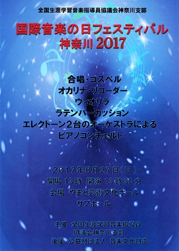 国際音楽の日フェスティバル神奈川 2017 国際音楽の日フェスティバル 2017.08.272021.08.08 2017年8月27日(日) 13時00分開場 13時30分開演やまと芸術文化ホール サブホール ファンタシカバテリアまじょりか – ヴィオリラ演奏All Of One Gospel Singers戸塚リコーダークラブコーラスゆきのしたみゅ~ずオカリナーズエレクトーンオーケストラによるピアノコンチェルト