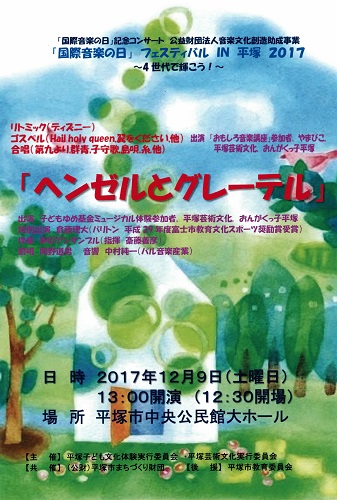 国際音楽の日フェスティバル IN 平塚 2017 国際音楽の日フェスティバル 2017.12.092021.08.13 2017年12月9日(土) 12時30分開場 13時00分開演平塚市中央公民館大ホール オープニング<リトミック>「ディズニー」より<ゴスペル><みんなで歌おう><合唱><ミュージカル>「ヘンゼルとグレーテル」<合唱><サウンド・オブ・ミュージックより>